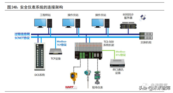 (2)SIS 安全仪表系统 。SIS(Safety Instrumented System)安全仪表系统相当于生产系统的“急刹车装置”,与 DCS“动静相宜”。相较于 DCS 需要对生产过程进行“动态控制”,SIS 是“静态”的,始终对系统进行监视,对异常情况进行快速处理,使危害降到最低。SIS 系统主要由传感器、逻辑控制器以及最终执行单元组成,用于实现一个或多个安全回路功能,达到工艺装置要求的安全完整性等级(SIL)。SIS是保障工厂安全运行的核心装备,在工业生产期间提供对设备、人身、环境的安全保护,避免恶性事故发生。SIS 主要应用于化工、石化、电力、油气、冶金等各个领域。