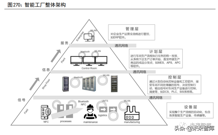 当前,全球工业行业正经历从工业 3.0 到工业 4.0 的升级发展中。工业4.0的核心是智能化,即利用用 AI、大数据等信息技术帮助企业充分利用过去积累的关于工艺技术、设备技术、运营技术等多方面的数据,实现安全生产、节能减排、降本增效等需求。我们认为现阶段智能工厂解决方案的架构组成主要包含四个部分,分别是管理层、计划层、控制层和设备层。1)顶层是管理层,对企业生产运营全流程(包括原材料购买及使用、生产制造、销售、售后服务等)进行管控,典型产品即为 ERP(Enterprise Resource Planning)软件。2)往下第二层是计划层层,主要依据管理层制定的生产制造环节的目标,进行车间生产流程执行任务的统一发放,从系统下达生产订单开始,直至终端生产商品的成品分发点,主要产品包括 MES(Manufacturing Execution System)、APS(Advanced planningandscheduling)、APC(Advanced Process control)等软件。3)控制层处于设备层与执行层之间,主要职能是通过大型自动化控制设备和工控软件,接受车间不同处理器的信号,决定控制行动,输出信号对车间生产设备进行控制、调度等。该环节的主要产品包括 DCS(Distributed Control System)、PLC(ProgrammableLogic Controller)、SIS(Safety Instrumented System)系统等。4)最底层是设备层,主要包含各类智能生产设备、传感器、控制阀等,实现整个生产流程的自动化。