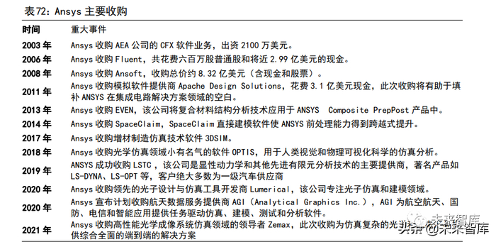 并购扩张是巨头必经之路。自 2000 年以来,Ansys 开启了并购之路。如2006年Ansys 收购 Fluent,Fluent 应用先进的 CFD(计算流体动力学)技术实现流体、热、传导等方面的仿真,奠定了 Ansys 在计算流体力学的地位。2008 年,Ansys收购 EDA 厂商 Ansoft,拓展了公司在集成电路、机械电子设计领域的应用。Ansys最强势的产品之一 LS-DYNA 也是在 2019 年收购而来。近两年收购来看,Ansys加强了光学仿真和航空航天的布局,尤其是光学领域,连续收购了Lumerical和Zemax,致力于实现完整的端到端光学仿真解决方案。以Ansys 为例,包括达索、Altair 等 CAE 巨头均是通过不断的收购实现产品线的持续扩张,因此也充分验证了 CAE 在各个细分工业领域里均需要深厚的 know-how 积累。各巨头也纷纷形成了结构、流体、多体、电磁全系列 CAE 产品矩阵,且每家均有一些拳头产品,形成了较强的技术和市场壁垒。