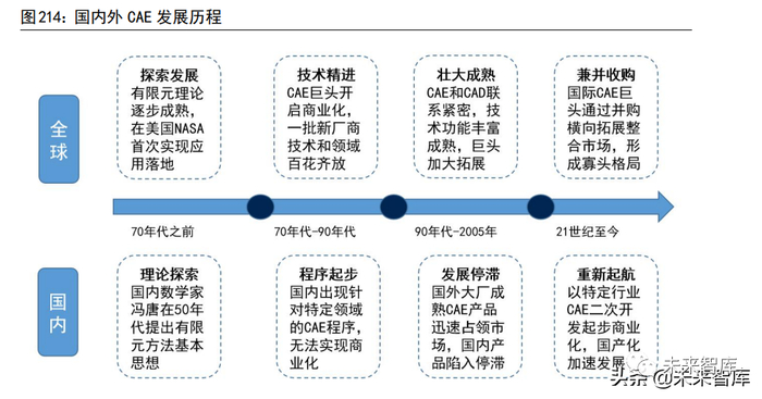 CAE 起源于航空航天领域,国外巨头已进入并购阶段。计算机辅助工程计算起源于 50 年代中期,CAE 软件诞生于 70 年代中初,随后CAE 的功能和算法不断完善,80 年代中期已逐步形成了商用的 CAE 软件。20 世纪60 年代,有限元理论处于发展阶段,CAE 最早的需求来自美国航空航天局 NASA,当时为了解决宇航工业对于结构分析的问题。随后世界几大 CAE 巨头陆续成立,如MSC、SDRC、ANSYS,致力于商业化的研究和落地。70 年代后,CAE 技术得到蓬勃发展,巨头持续提升技术和创新应用,并开启商业化;同时一大批新 CAE 厂商成立,各厂商技术和行业侧重各不相同,呈现百花齐放状态。90 年代后,CAD 的发展为CAE 技术提升进一步打下基础,CAE 软件也开始积极与 CAD 对接接口,进一步扩展CAE 功能;CAE巨头加大市场拓展,持续壮大成熟。21 世纪开始,国际CAE 巨头开启并购重组,通过收购来实现横向扩展并整合市场,如 ANSYS 通过并购,最终解决热力耦合问题的分析求解,当前 CAE 市场主要由 Ansys,Dassult Systems,Altair,MSC,西门子等厂商垄断。