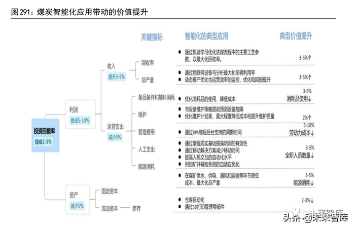 智能矿山的最终目标是通过无线全覆盖与智能控制的技术基础,达到无人值守的技术结果和无人员伤亡的愿景,实现煤矿生产全流程的绿色、安全和高效。从生产效率提升带来的效益测算,根据麦肯锡数据,全面实现智能化的煤炭企业预计能实现利润提升 7%-12%,煤矿投资回报率提升 2%-3%。