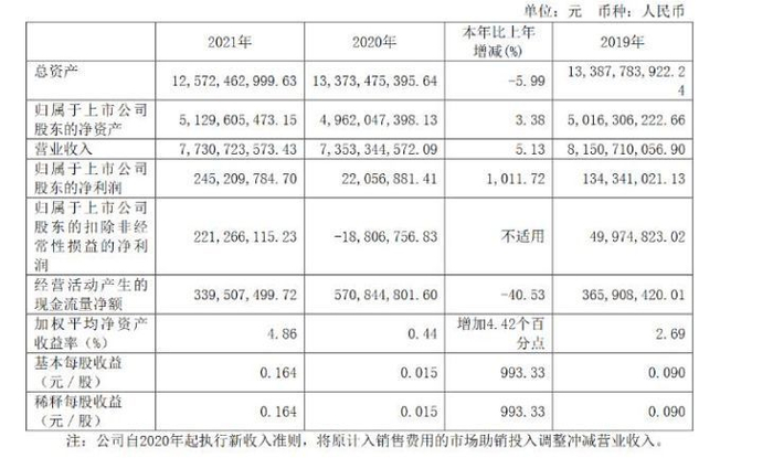 三元股份2021年年报显示,2019年―2021年,三元股份营收从约81.51亿元下降至约77.31亿元,各年增速分别为9.32%、-9.78%和5.13%,虽然2021年有所回升,但总体而言其增速明显下降。净利润方面,三元股份在2019及2020年分别下降25.51%、83.58%,降幅明显,但其2021年净利润约2.45亿元,同比2020年增长1011.72%。