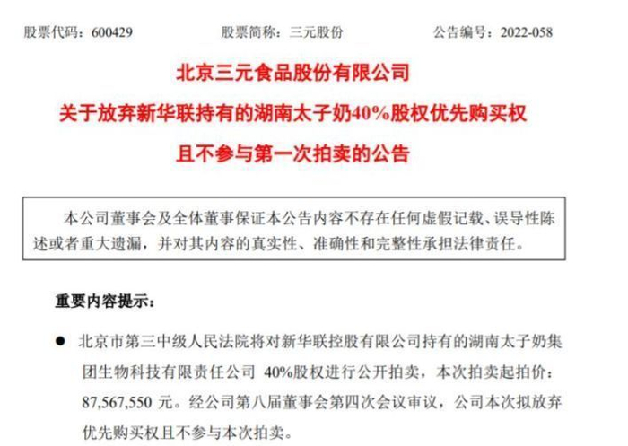 而三元股份也从表示放弃太子奶股份的优先购买权且不参与拍卖,到最终还是选择接手这40%股权。