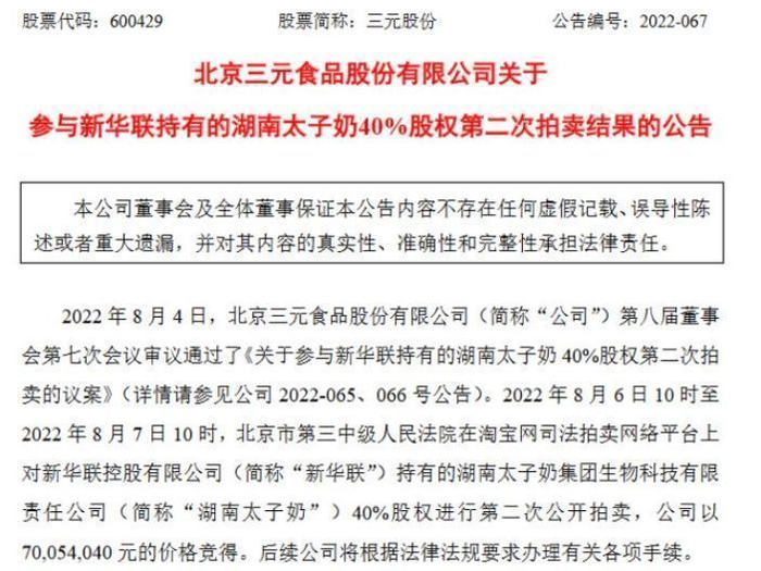 近日,曾因巨额债务销声匿迹的太子奶,因“卖股”一事再次回归大众视野。8月8日,三元股份发布公告称,公司以约7005.4万元的价格竞得湖南太子奶40%的股权。