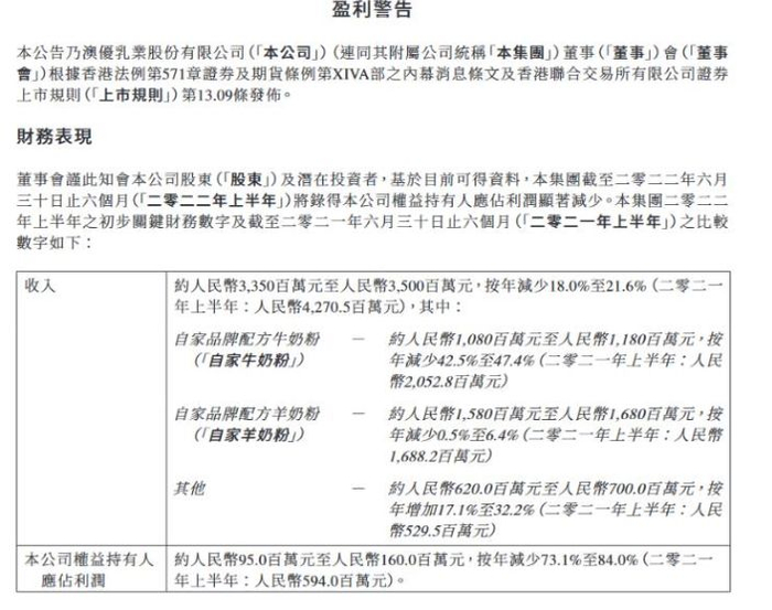 据7月3日澳优发布的盈利预警,2022年上半年,公司预计收入约33.5亿元至35亿元,按年减少18.0%至21.6%;归母净利润约9500万元至1.6亿元,按年减少73.1%至84.0%。