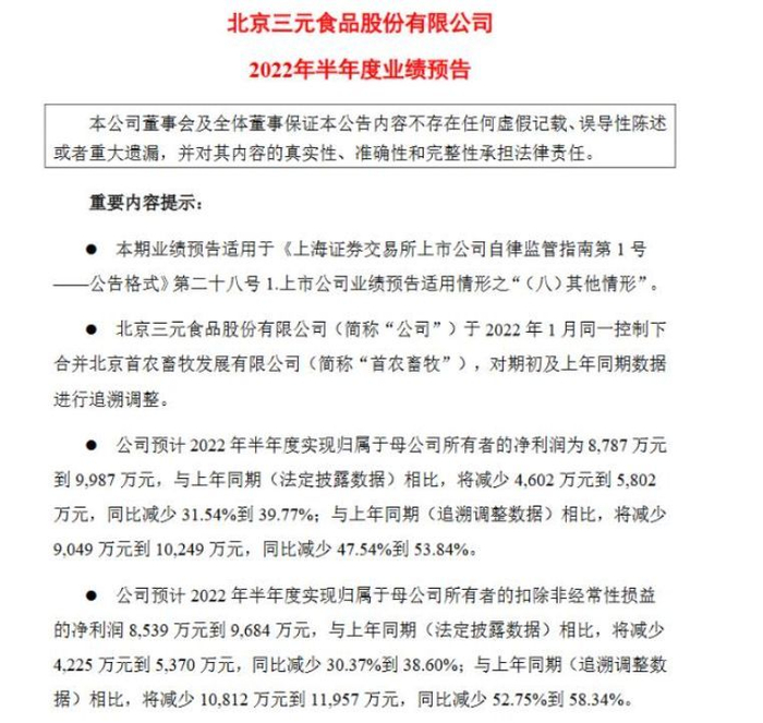 今年7月,三元股份披露了2022年半年度业绩预告,预计2022年半年度实现营业收入42.6亿元左右,实现归属于母公司所有者的净利润为8787万元到9987万元,与上年同期(法定披露数据)相比,将减少4602万元到5802万元,同比减少31.54%到39.77%;与上年同期(追溯调整数据)相比,将同比减少47.54%到53.84%。