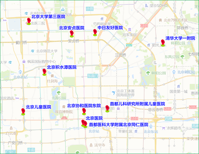 工作日早间至上午时段,北医三院、北京医院、儿童医院、同仁医院、安贞医院、积水潭医院等医院周边道路和桥区节点将出现车流集中的情况,高峰时段为上午7—11时。