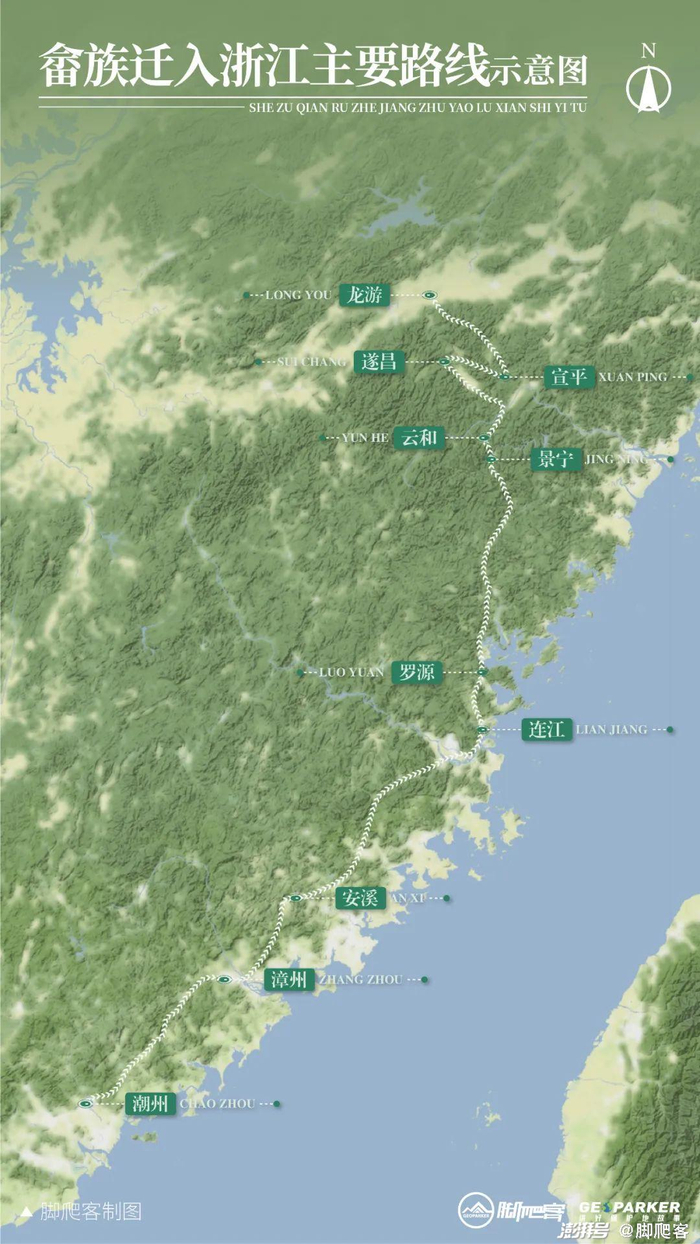 据畲族各族族谱等文本记载,有研究推论畲族曾在很长的一段时间中分散迁徙,其中有一支迁徙至宣平后定居,宣平后被划给了毗邻的莲都、松阳、武义三区县,其中莲都即为东西岩所在之地,该图仅供参考©脚爬客/制图