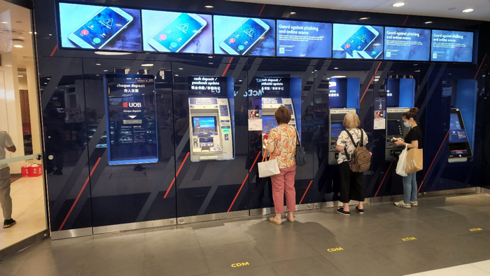 8月10日,三位客户在新加坡大华银行的存取款ATM机前操作。