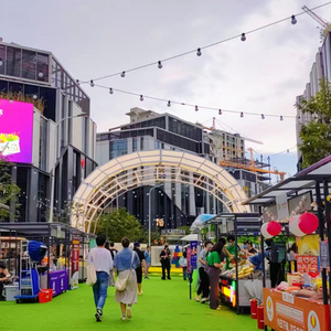“市集的质感和显示度也很重要。”林莹莹说。凯田集荟的运营邀请了经验丰富的策划团队,在现场可以看到安义夜巷、外滩枫径等“前辈”步行街中颇受欢迎的元素,比如diy业态、宠物业态、“一米市集”等品牌,现场布置也引入了灯光拱门、五颜六色的堆叠装置等,很适合打卡拍照。