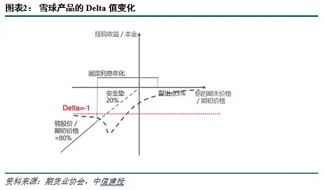 而在标的市场连续大跌时,雪球产品的负面影响其实也比较小。先从理论基础出发去思考,市场大跌时,雪球Delta在敲入前出现断崖,这是因为当标的价格接近敲入价格时障碍看跌期权接近生效,同时获得普通看跌期权的Delta以及敲入概率增加导致的Delta,两者相加绝对值较大。而后标的价格跌穿敲入价格,产品损益等同于标的本身损益,此时雪球产品可以近似于普通看跌期权空头,Delta逐渐回归趋近于-1,此时对标的市场的影响相对有限。另外,再结合业务实质分析原因如下: