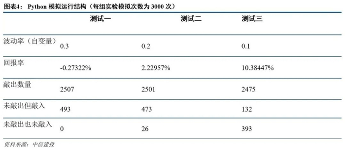 从收益计算来看我们能将前述的四种收益情景概况为三种收益结果:1)提前发生敲出,收益为到敲出时为止的票息;2)发生敲入但未敲出,收益等同于一般期权;3)未敲出且未敲入,收益为红利票息。根据频率估计概率,将所有模拟路径收益率加总后取均值即可认为是期权的期望收益率。输出模拟的波动,敲出、未敲入未敲出和敲入且未敲出三种情况各自发生的次数,以及对应的期望收益率。
