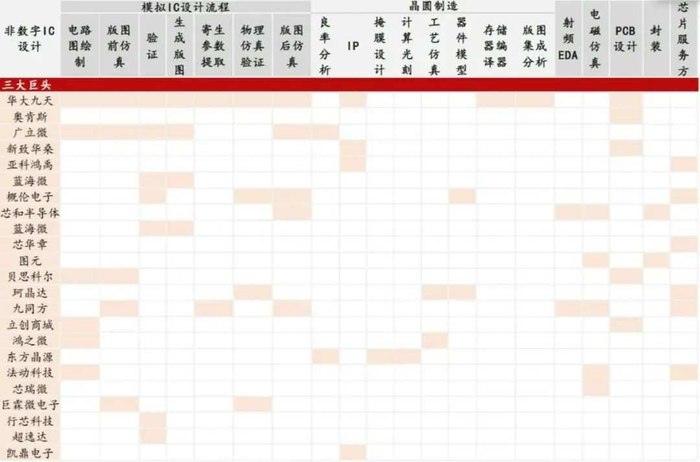 天风国际称,国产化势在必行。其研报称,EDA工具链大约有40个细分领域,三大巨头目前实现了全产业链覆盖,而国产龙头华大九天目前的覆盖率约40%,其他国产EDA厂商产品多为点工具,更不能为客户提供特定区域全流程产品服务。