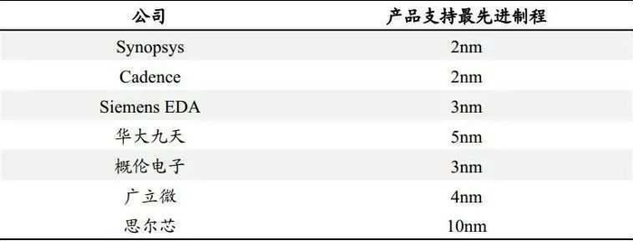 另外,目前国际三大巨头能支持的最先进工艺已经达到2nm,而国内厂商仅有部分产品支持较先进的工艺制程。如华大九天仅有一款支持5nm,思尔芯支持10nm制程,其余仅支持28nm制程。
