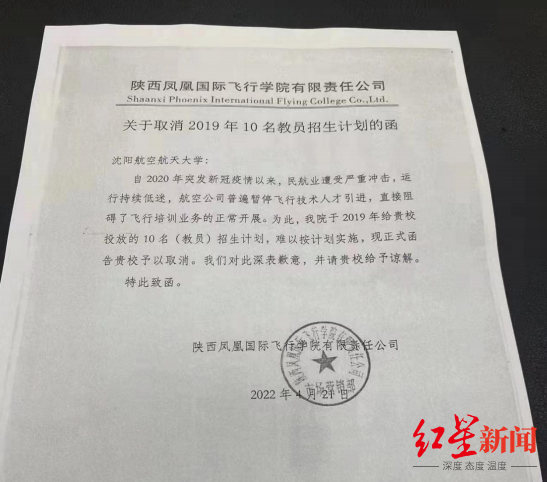 几名沈阳航空航天大学的学生家长向红星新闻记者提供了解约飞行学校的解约函,包括:《西安航空基地金胜通用航空有限公司关于放弃2019级30名养成学员培养计划的函》《陕西凤凰国际飞行学院有限公司关于取消2019级10名教员招生计划的函》《青岛九天国际飞行学院股份有限公司关于取消2019级10人招生计划的函》。其中《陕西凤凰国际飞行学院有限公司关于取消2019级10名教员招生计划的函》提到,“自2020年突发新冠疫情以来,民航业遭受严重冲击,运行持续低迷,航空公司普遍暂停飞行技术人才引进,直接阻碍了飞行培训业务的正常开展。为此,我院于2019年给贵校投放的10名(教员)招生计划,难以按计划实施,现正式函告贵校予以取消。我们对此深表歉意,并请贵校给予谅解。”