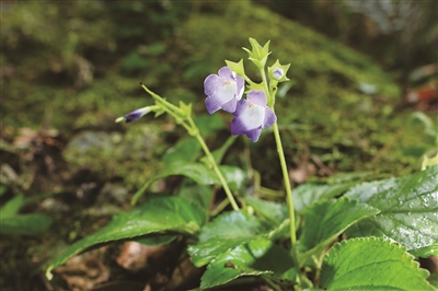 大花旋蒴苣苔亦为多年生草本,在宁波比旋蒴苣苔要少见,属于本地珍稀植物,花期在七八月间。幸运的话,在四明山的岩壁上,可同时见到大花旋蒴苣苔与旋蒴苣苔这两种“自带仙气”的野花。大花旋蒴苣苔的花朵的外形与旋蒴苣苔近似,但要大上一号,且具有更深的蓝色;其叶子则颇似菜叶,与旋蒴苣苔的叶子截然不同。作为典型的岩生植物,这两种旋蒴苣苔都有很强的耐旱能力,可以生存在干旱脱水的环境中,一旦遇水便能迅速复苏。