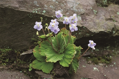 旋蒴苣苔是多年生草本植物,在宁波山区属于丹霞地貌的岩壁上不难见到。这种植物俗称“猫耳朵”,显然跟其叶子的特征有关:叶紧贴岩壁而生,呈莲座状,叶子近圆形,有很多白色柔毛,状如猫耳。旋蒴苣苔的花期较长,我曾经在5月上旬就看到有少量开花,然后到8月还能看到花,而盛花期似在六七月间。我非常喜欢旋蒴苣苔的花,其花冠为淡淡的蓝紫色,在阳光下显得晶莹剔透,把坚硬的岩石点缀得生机盎然。