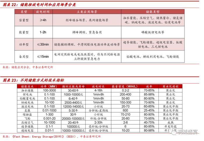 不同储能形式具有不同的技术性、经济性和适用场景。按照时长不同,储能的应用场景大致可分为:容量型、能量型、功率型和备用型四类。容量型储能场景包括削峰填谷或离网储能等,时储能技术种类较多,包括抽水蓄能、压缩空气、储热蓄冷、储氢储碳以及各类容量型储能电池(例如钠硫电池、液流电池、铅炭电池、锂浆料电池等)。