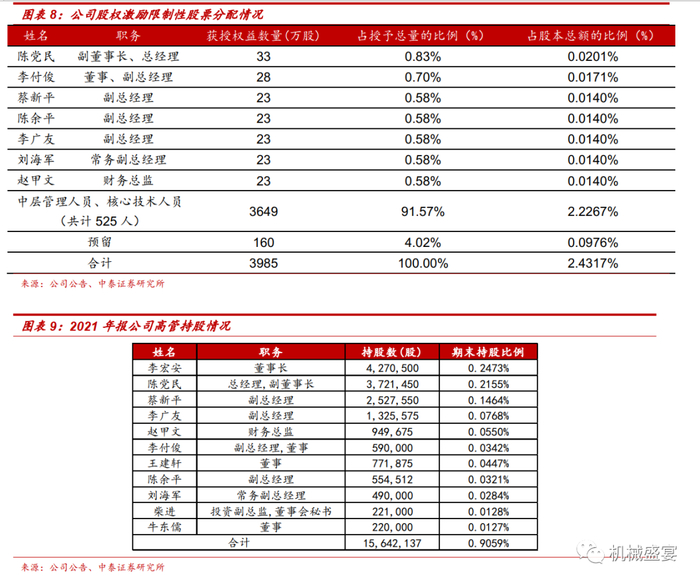 ②股权激励:在国企固有的激励机制下,勤奋程度、经营成果与薪酬绩效关系不紧密,管理层积极性容易受挫。2021年,公司高管持股合计总股本的0.91%,是国企改革的先行典范。2018年公司首次实施限制性股票激励计划,2019年3月5日授予532名管理人员及核心技术人员合计3825万股、预留160万股限制性股票,共占公司总股本的2.43%。此计划有利于建立激励约束长效机制,实现企业与员工的共创共享,充分激发企业活力。