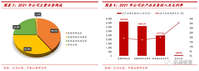 三大业务以能量转换设备制造板块为主。2021年公司营业收入合计103.61亿元,其中能量转换设备制造板块实现营收41.52亿元,同比增长3.25%,占比40.07%;工业服务和能源基础设施运营板块分别实现营收36.22亿元、24.78亿元,占比34.96%、23.91%,同比增长76.92%、27.11%。