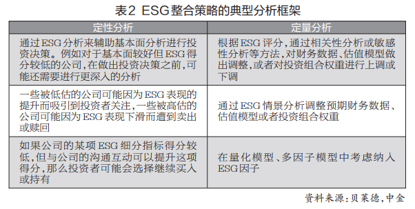 其中ESG整合是一种全面的投资分析方法,分别采用定性和定量方法,将ESG理念与传统财务信息等相融合,进行全面的项目评估,以形成投资决策,即在原有的投资策略中加入ESG因素。(见表2)