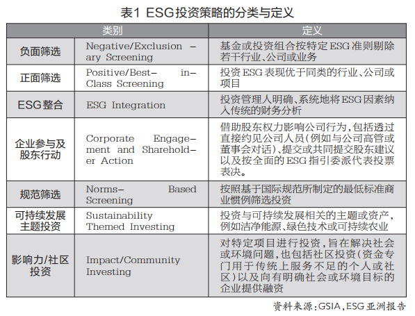 GSIA对市场上投资机构ESG投资进行的统计分析显示,ESG投资策略主要分为7类:负面筛选、正面筛选、ESG整合、企业参与及股东行动、规范筛选、可持续发展主题投资和影响力/社区投资,这也是全球目前认可度最高的分类标准。(见表1)