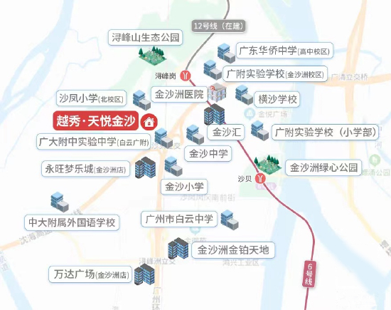项目楼下公交总站、金沙洲大桥、广州环城高速、地铁6号线(浔峰岗站)形成立体交通路网,连接市内各大核心商圈,速达火车站商圈、北京路商圈和珠江新城商圈。广佛大桥(预计2024年通车)、沉香岛大桥(2025年通车)、地铁12号线(预计2024年建成通车),快速通往白云、荔湾等中心区域,通勤时间将大大缩短。