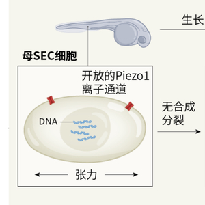 图1|无合成分裂。斑马鱼幼鱼有一个快速生长期,此时其皮肤的表面上皮细胞(surface epithelial cell,SEC)数量必须迅速增加,才能构成生物体与外界之间的保护屏障。陈振辉等人[1]报道,斑马鱼幼鱼皮肤扩张过程中的张力使表面上皮细胞能在不复制其DNA的情况下进行分裂(通过涉及离子通道蛋白Piezo1开放活性的未明机制)。这种“无合成分裂”(asynthetic fission)所产生的子细胞比它们的母细胞更平、更小,DNA等生物材料也比母细胞要少。但是,它们总的表面积更大,能保障对生长中幼鱼的体表覆盖。