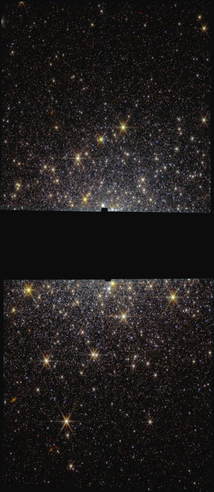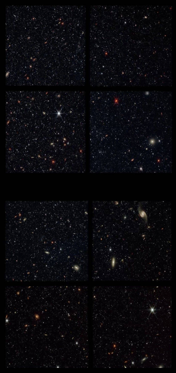 这是北斗七星斗柄附近的天区,由韦伯望远镜的近红外相机拍摄的690张单帧图像叠加拼接而成,覆盖的天区面积是韦伯公布的首张深场照片的8倍。
