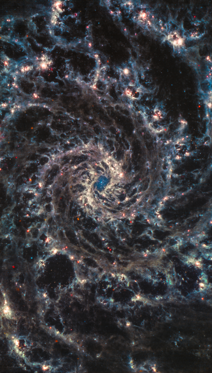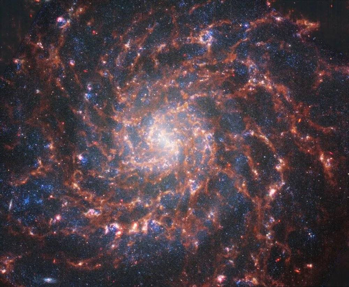韦伯在中红外波段拍摄的影像(上图中的红色),同样揭示出了这个星系中尘埃的螺旋状分布。