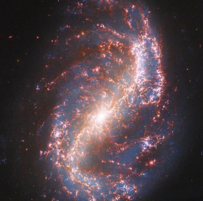 韦伯望远镜在中红外波段拍摄的棒旋星系NGC 7496,叠加在哈勃望远镜拍摄的可见光图像之上 | NASA/ESA/CSA/Judy Schmidt
