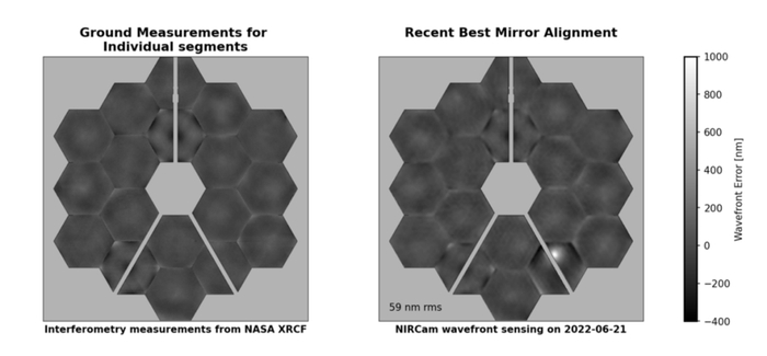 韦伯望远镜主镜片的对齐情况,左为几年前在地面实验室测得的理想状态,右为6月21日在太空实测的状况,右下那块主镜片上可见明显凹痕 | NASA/STScI