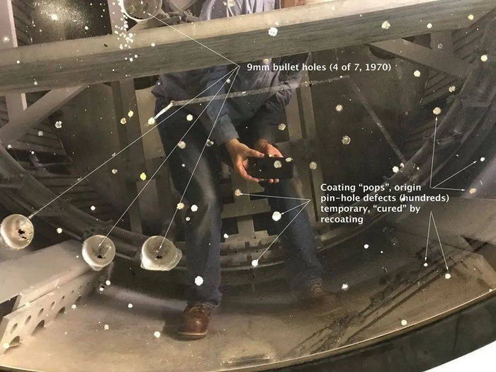 107英寸望远镜主镜上留下的弹孔和被锤子砸崩了的凹坑,摄于2019年主镜被拆下来重新镀膜之时 | JJ Hermes