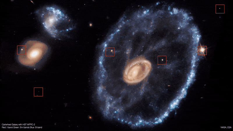 哈勃望远镜与韦伯望远镜拍摄的车轮星系对比 | NASA/ESA/CSA/STScI/Mark McCaughrean