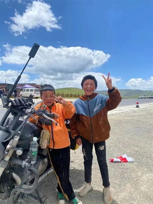吴卓邦的摩托车和藏族小孩的合影