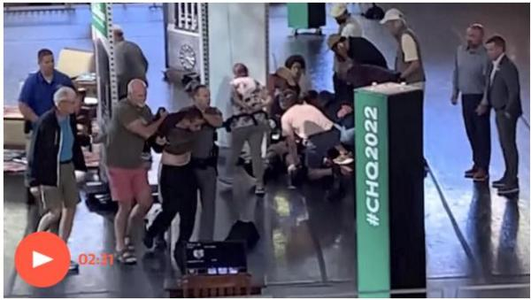 就在拉什迪登台后,主持人对他作介绍之时,一名身着黑衣的男子冲上讲台,对拉什迪大叫大嚷,同时挥舞尖刀,对他发动袭击,拉什迪很快倒在血泊中,随后被空运至医院并接受了手术。