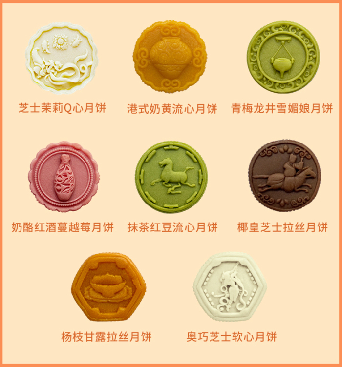 据介绍,此次文创月饼的设计结合了铜奔马、驿使图、人头形器口彩陶瓶、鼎形铜行灯、莲花形玻璃托盏、涡纹彩陶瓮、反弹琵琶和飞天等8个甘肃省博物馆代表性文物元素,以“月之盈亏”联结文物的历史时间线,分别对应抹茶红豆流心、椰皇芝士拉丝、奶酪红酒蔓越莓、青梅龙井雪媚娘、杨枝甘露拉丝、港式奶黄流心、奥巧芝士软心和芝士茉莉Q心等8种不同口味的月饼。8个甘博国宝文物对应8种独特口味,能让人在享受美味的同时,体验到文创产品背后的特色文化内涵。