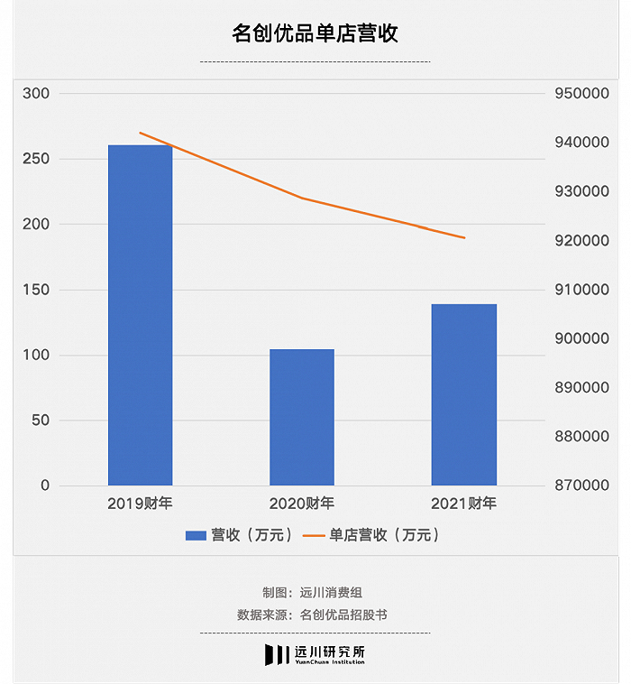 但在2020-2021财年,名创优品的单店收入分别同比下降19.8%和11.3%,这意味着加盟商每月拿到手里的真金白银是切实地变少了。