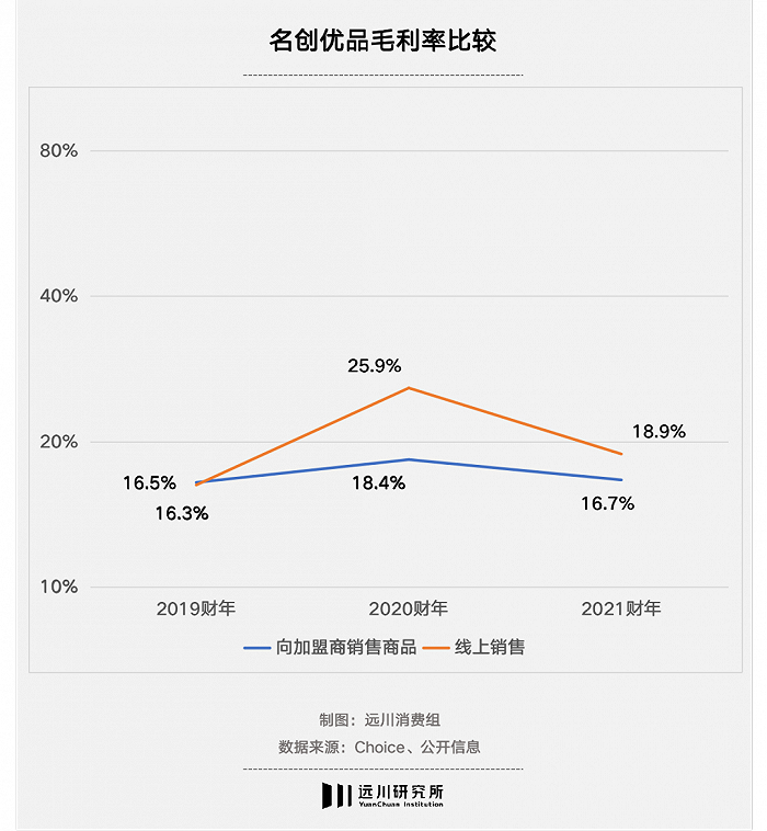 这一趋势愈演愈烈的2021财年,名创优品线上销售额已经约占总销售额的10%。毛利率方面,线上销售也实现了对线下加盟商的反超,2021财年达到18.9%;去年下半年更进一步达到22.3%,比线下加盟商渠道高4.5个百分点。