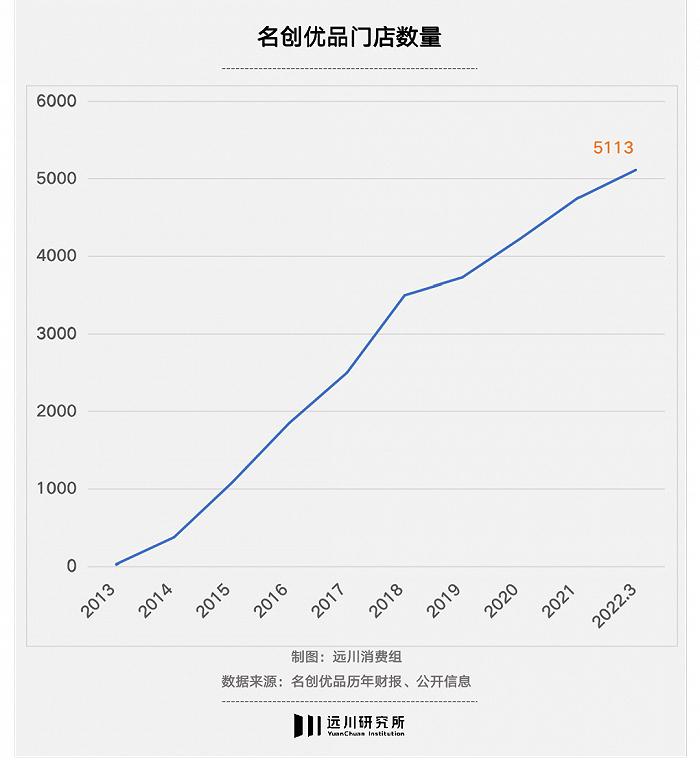 因此,2013年只有27家门店的名创优品五年后开到了3500家门店,翻了130倍,平均每年开店700家[2]。2022年,这一数字增长至5000多家,名创优品用9年的时间就完成了前辈大创百货用46年才完成的事情。