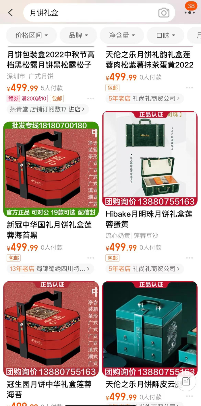 8月15日,中新经纬在某电商平台上搜索“月饼礼盒”,并选择价格从高到低排序,结果发现不少月饼礼盒标价为499.99元,距离500元监管红线仅有一分钱之差,不过仅有个别商品显示有人付款,多数礼盒月销量为0。
