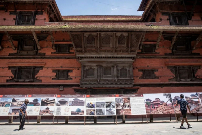 7月15日,在尼泊尔加德满都,行人经过修复后的九层神庙建筑群。中国援助加德满都杜巴广场九层神庙建筑群修复项目文物本体维修,于近日圆满完成 图:新华社