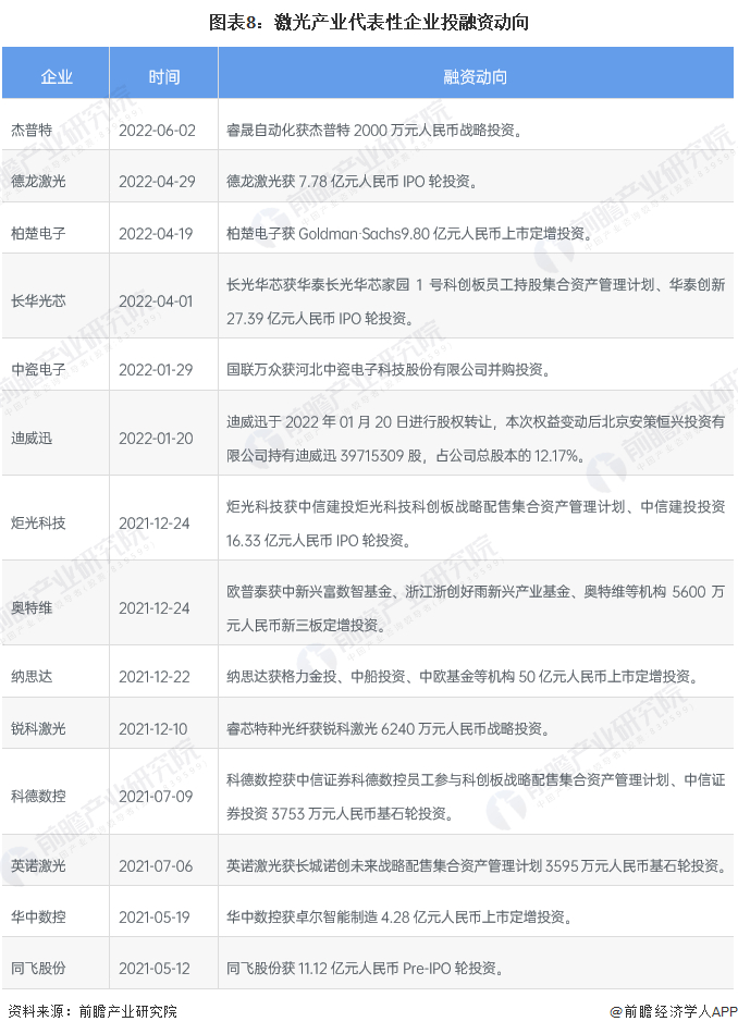 激光产业代表性企业最新投融资动向