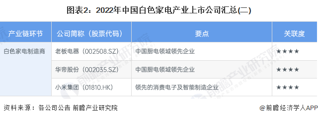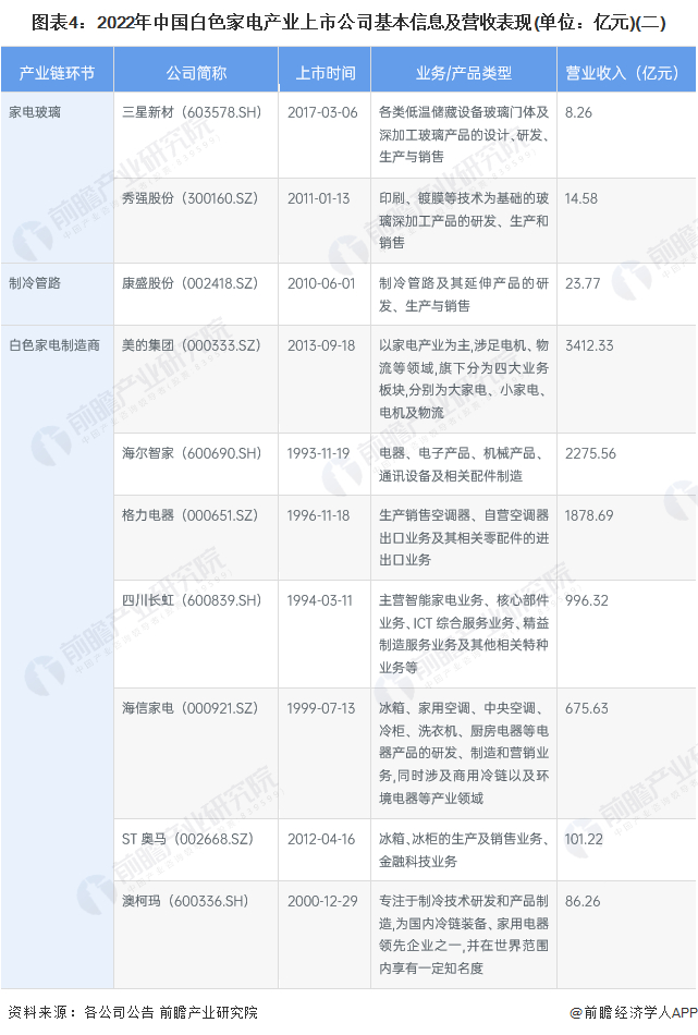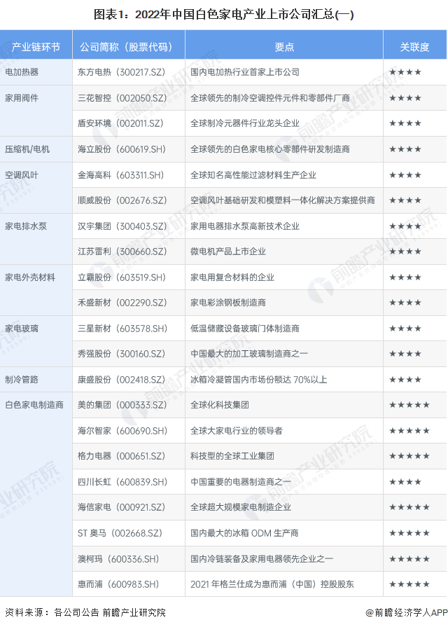 白色家电上游零部件环节主要有电加热器、家用阀件、压缩机/电机、空调风叶、家电排水泵、家电外壳材料、家电玻璃、制冷管路,代表企业有三花智控、海立股份等。中游白色家电整机制造商有美的集团(000333.SZ)、海尔智家(600690.SH)、格力电器(000651.SZ)、四川长虹(600839.SH)、海信家电(000921.SZ)、ST奥马(002668.SZ)、澳柯玛(600336.SH)、惠而浦(600983.SH)、老板电器(002508.SZ)、华帝股份(002035.SZ)、小米集团(01810.HK)。