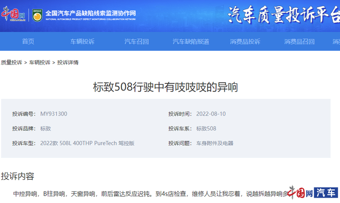 中国网汽车8月16日讯 (记者 王忆东)经常被人忽视的车辆异响问题看似并不严重,但如果长期频繁发生,不但对车主驾驶及车内乘客造成困扰,还会对车辆行驶安全构成危险隐患。近日,中国网汽车投诉平台就接到一位东风标致车主投诉称,自己的2022款508L刚买不久就出现多处异响情况,更令车主不能忍受的是“4S店维修人员让我忍着……”。截至发稿前,车主反馈该车辆问题还未得到妥善解决。