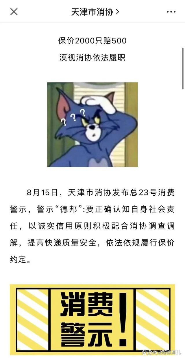 网友并不认可,这个赔付方案,于是就将德邦快递告到了天津市消费者协会,消费者协会认为德邦快递的保价声明就相当于双方的合同,既然两者签了合同就应该按照合同执行,不但不积极解决该问题,还只赔偿了500元,侵犯了消费者的合法权益,因此消费者协会认为其基本的诚信意识缺失,并发出警示。