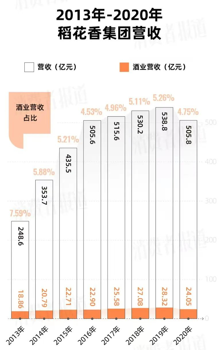 稻花香集团是湖北省知名企业,在该省企业100强榜上常年位居前10位。早在2012年,集团便提出了“打造500亿产业集群”的目标。公开资料显示,2013年到2020年稻花香集团营收从248亿元增长到超过500亿元。