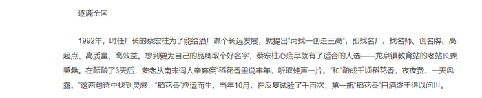 在其宣传资料中,2011年“稻花香”被认定为“中华老字号”。中华老字号的评选标准中有一条:是必须在1956年之前建立,查阅过往报道,《消费者报道》发现,“稻花香”品牌名是1992年由龙泉镇教育站的老站长姜秉彝确定的。如此短的品牌历史是如何被评为“中华老字号”的?