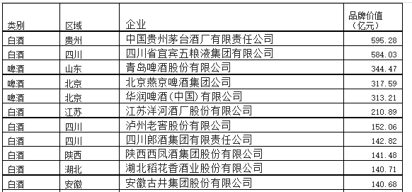 《消费者报道》查询相关资料得知,第三届“华樽杯”酒类品牌价值排行榜前10名为:茅台、五粮液、青岛啤酒、燕京啤酒、华润啤酒、洋河、泸州老窖、郎酒、西凤、稻花香,知名酒类品牌古井贡酒、剑南春、白云边、劲酒等位列其后。