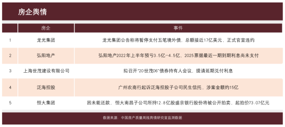 在房企舆情层面,本周中国质量万里行全网监测后发现舆情风险较高的房企包括龙光集团、弘阳地产、上海世茂建设有限公司、泛海控股以及恒大集团,涉及话题包括“龙光集团美元债官宣违约”、“弘阳地产宣告上半年预亏损”、“20世茂06”提请延期兑付利息、“广州农商行起诉泛海控股子公司”以及“恒大南昌子公司所持盛京银行股份被公开拍卖”等。